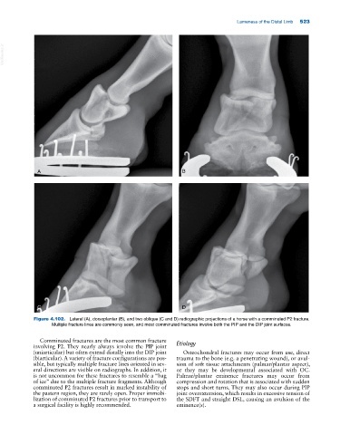Figure 4.102. Lateral (A), dorsoplantar (B), and two oblique (C and D) radiographic projections of a horse with a comminuted P2 fracture.