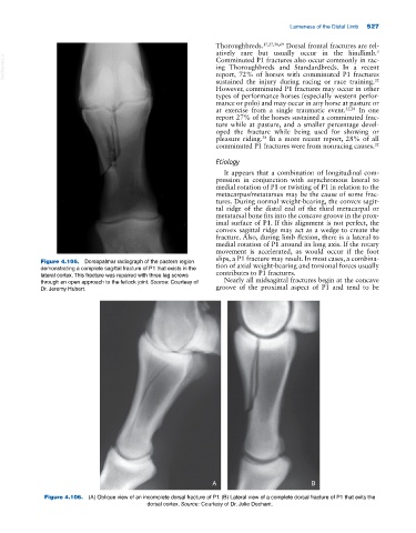 Figure 4.106. (A) Oblique view of an incomplete dorsal fracture of P1. (B) Lateral view of a complete dorsal fracture of P1 that exits the