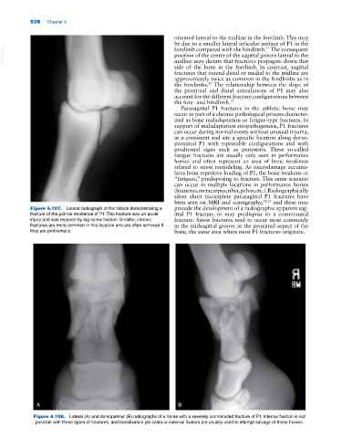 Figure 4.108. Lateral (A) and dorsopalmar (B) radiographs of a horse with a severely comminuted fracture of P1. Internal fixation is not