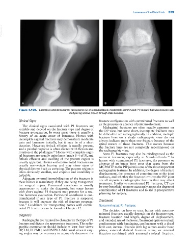 Figure 4.109. Lateral (A) and dorsoplantar radiographs (B) of a nondisplaced, moderately comminuted P1 fracture that was repaired with