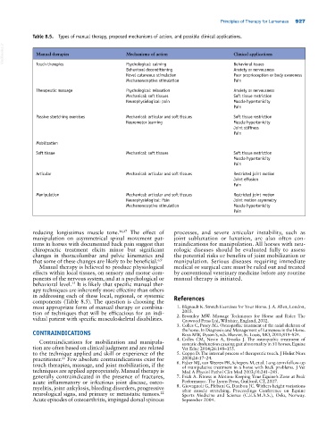 Table 8.5. Types of manual therapy, proposed mechanisms of action, and possible clinical applications.