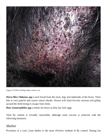 Horse flies (Tabanus spp.) suck blood from the neck, legs and underside of the horse. Their