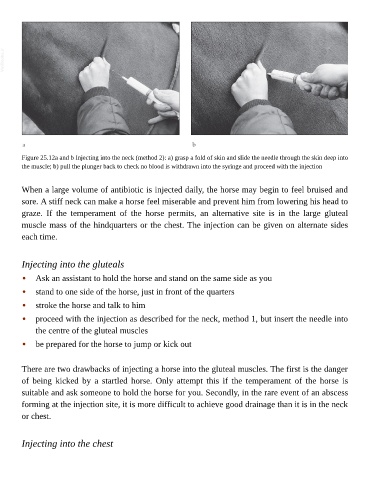 Figure 25.12a and b Injecting into the neck (method 2): a) grasp a fold of skin and slide the needle through the skin deep into