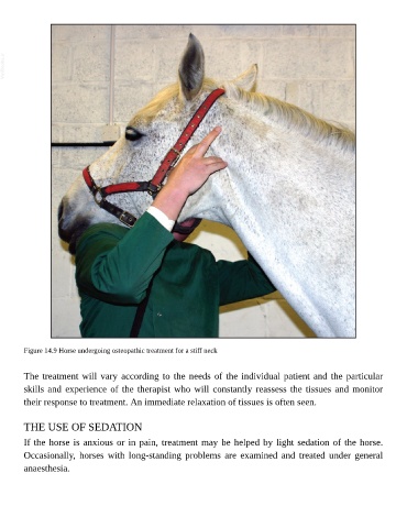 Figure 14.9 Horse undergoing osteopathic treatment for a stiff neck