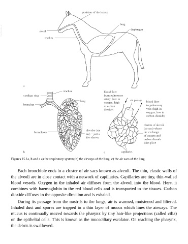 Figures 15.1a, b and c a) the respiratory system; b) the airways of the lung; c) the air sacs of the lung