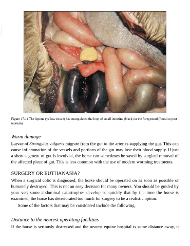 Figure 17.11 The lipoma (yellow tissue) has strangulated the loop of small intestine (black) in the foreground (found at post