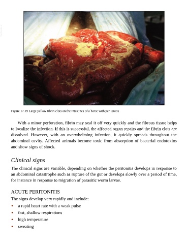 Figure 17.19 Large yellow fibrin clots on the intestines of a horse with peritonitis