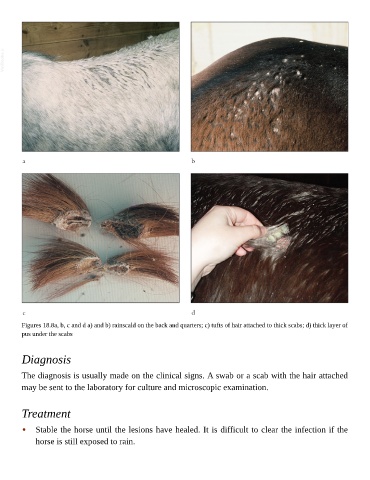 Figures 18.8a, b, c and d a) and b) rainscald on the back and quarters; c) tufts of hair attached to thick scabs; d) thick layer of