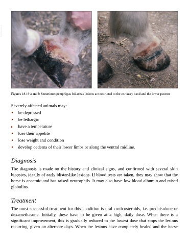 Figures 18.19 a and b Sometimes pemphigus foliaceus lesions are restricted to the coronary band and the lower pastern