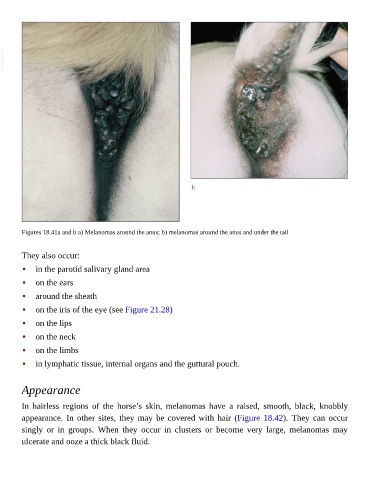 Figures 18.41a and b a) Melanomas around the anus; b) melanomas around the anus and under the tail
