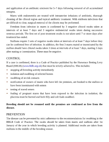 Freedom from infection in mares is confirmed by 3 negative clitoral swabs taken at