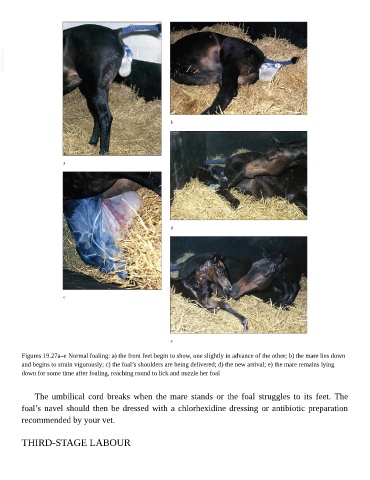 Figures 19.27a–e Normal foaling: a) the front feet begin to show, one slightly in advance of the other; b) the mare lies down
