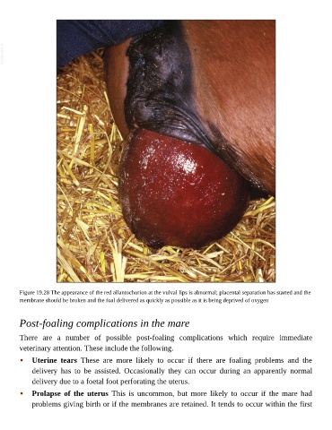 Figure 19.28 The appearance of the red allantochorion at the vulval lips is abnormal; placental separation has started and the