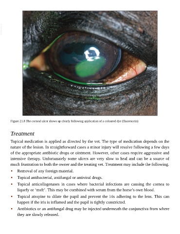 Figure 21.8 The corneal ulcer shows up clearly following application of a coloured dye (fluorescein)