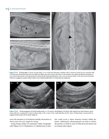 Figure 22.15  Ultrasonography of string foreign body in a 10-month-old domestic shorthair with weight loss and anorexia. (a) An