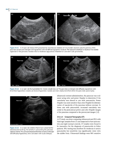 Figure 24.12 A 12-year-old DLH presented for chronic weight loss. (a) The pancreas is enlarged and diffusely hypoechoic with