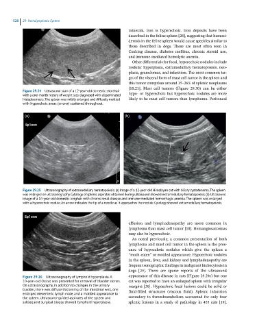 Figure 29.25 Ultrasonography of extramedullary hematopoiesis. (a) Image of a 12-year-old Himalayan cat with biliary cystadenoma. The spleen