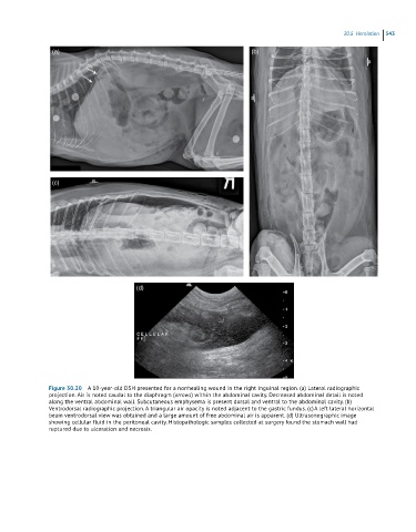 beam ventrodorsal view was obtained and a large amount of free abdominal air is apparent. (d) Ultrasonographic image