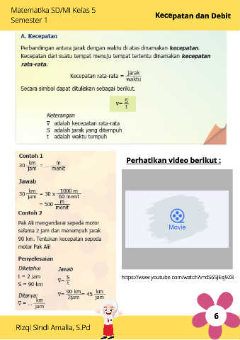 Matematika SD/MI Kelas 5 Kecepatan dan Debit Semester 1 Perhatikan video berikut : https://www.youtube.com/watch?v=dS65JEsj9Z8 6 Rizqi Sindi Amalia, S.Pd