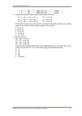 9. Diketahui potensial reduksi standar untuk reaksi sel berikut: