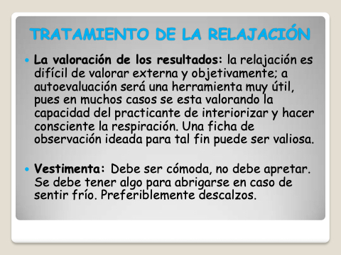 La valoración de los resultados: la relajación es difícil de valorar externa y objetivamente; a autoevaluación será una herramienta muy útil, pues en muchos casos se esta valorando la capacidad del practicante de interiorizar y hacer consciente la respiración. Una ficha de observación ideada para tal fin puede ser valiosa.