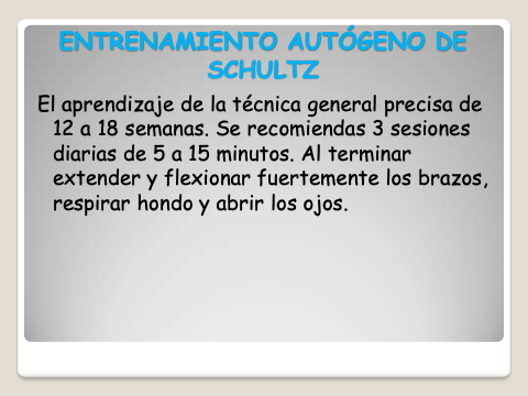 ENTRENAMIENTO AUTÓGENO DE SCHULTZ El aprendizaje de la técnica general precisa de 12 a 18 semanas. Se recomiendas 3 sesiones diarias de 5 a 15 minutos. Al terminar extender y flexionar fuertemente los brazos, respirar hondo y abrir los ojos.