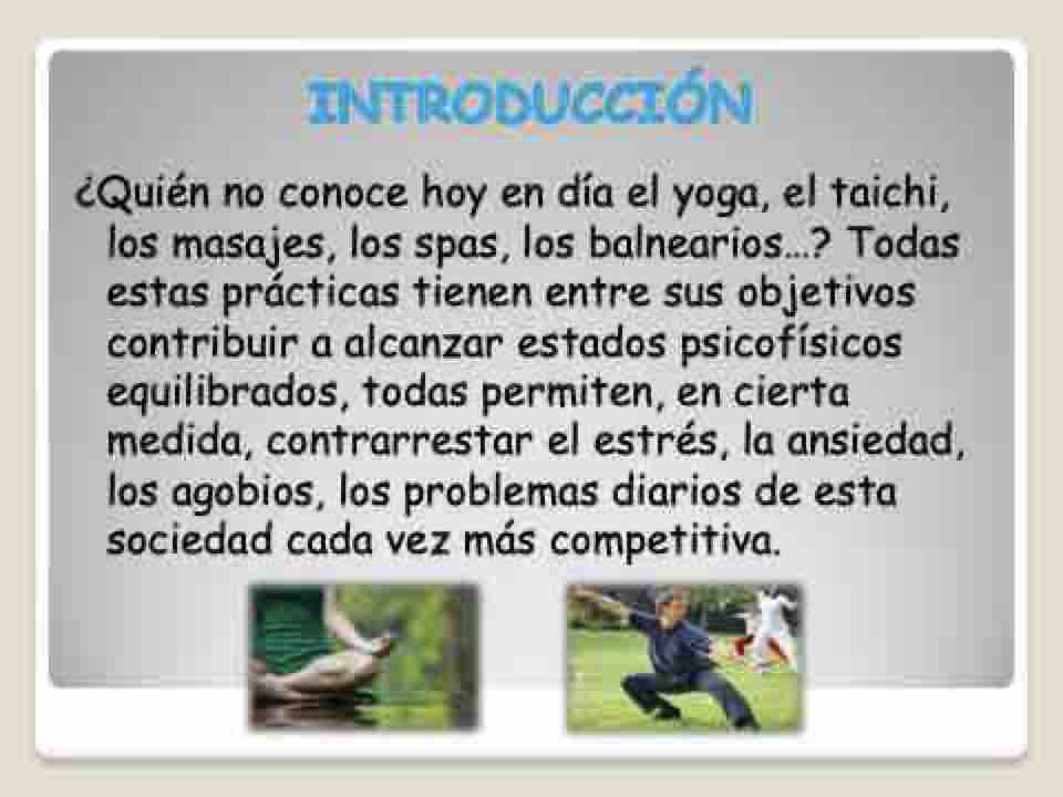 ¿Quién no conoce hoy en día el yoga, el taichi, los masajes, los spas, los balnearios...? Todas estas prácticas tienen entre sus objetivos contribuir a alcanzar estados psicofísicos equilibrados, todas permiten, en cierta medida, contrarrestar el estrés, la ansiedad, los agobios, los problemas diarios de esta sociedad cada vez más competitiva.