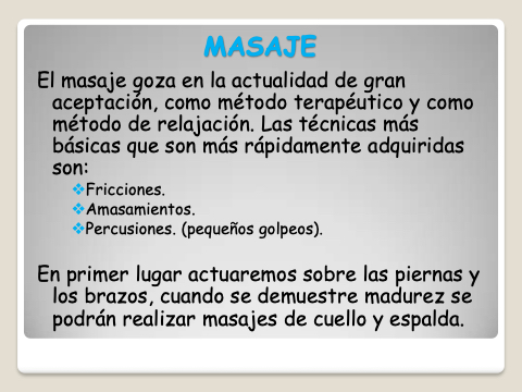 El masaje goza en la actualidad de gran aceptación, como método terapéutico y como método de relajación. Las técnicas más básicas que son más rápidamente adquiridas son: