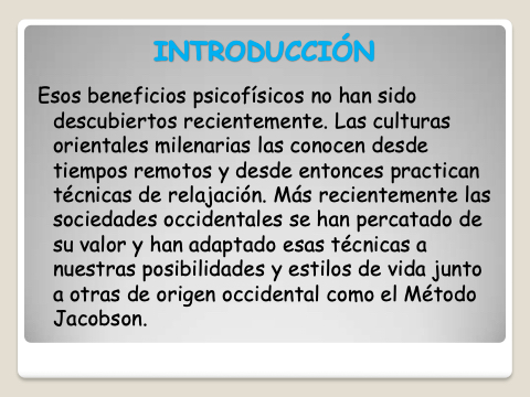 Esos beneficios psicofísicos no han sido descubiertos recientemente. Las culturas orientales milenarias las conocen desde tiempos remotos y desde entonces practican técnicas de relajación. Más recientemente las sociedades occidentales se han percatado de su valor y han adaptado esas técnicas a nuestras posibilidades y estilos de vida junto a otras de origen occidental como el Método Jacobson.