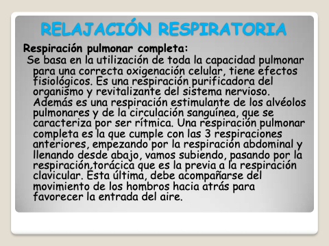 Se basa en la utilización de toda la capacidad pulmonar para una correcta oxigenación celular, tiene efectos fisiológicos. Es una respiración purificadora del organismo y revitalizante del sistema nervioso. Además es una respiración estimulante de los alvéolos pulmonares y de la circulación sanguínea, que se caracteriza por ser rítmica. Una respiración pulmonar completa es la que cumple con las 3 respiraciones anteriores, empezando por la respiración abdominal y llenando desde abajo, vamos subiendo, pasando por la respiración torácica que es la previa a la respiración clavicular. Ésta última, debe acompañarse del movimiento de los hombros hacia atrás para favorecer la entrada del aire.