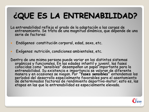La entrenabilidad refleja el grado de la adaptación a las cargas de entrenamiento. Se trata de una magnitud dinámica, que depende de una serie de factores: