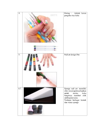 4. Doting : Adalah Jarum pengoles rias kuku 5. Nail art design Pen 6.7. Sponge nail art: memiliki sifat meyerapdimanfaatkan untuk merias kuku fungsinya memberi efek ombrepada kuku. Terdapat berbagai bentuk dan warna sponge