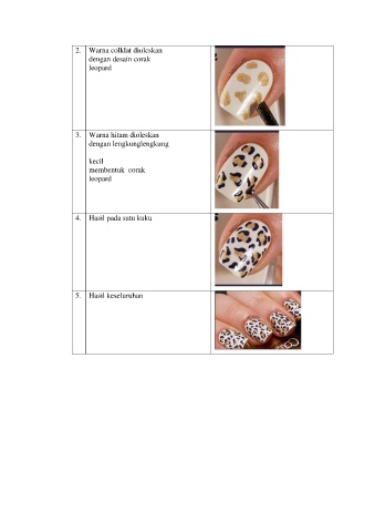 2. Warna colklat dioleskan dengan desain corak leopard 3. Warna hitam dioleskan dengan lengkunglengkung kecil membentuk corak leopard 4. Hasil pada satu kuku 5. Hasil keseluruhan