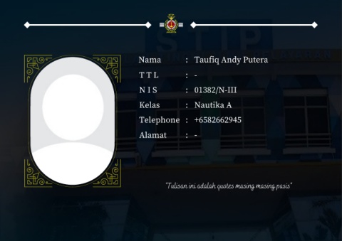 Nama : Taufiq Andy Putera T T L : - N I S : 01382/N-III Kelas : Nautika A Telephone : +6582662945 Alamat : - "Tulisan ini adalah quotes masing masing pasis"