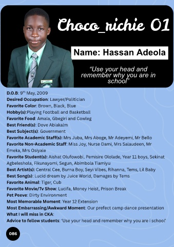 Favorite Academic Staff(s): Mrs Juba, Mrs Aboge, Mr Adeyemi, Mr Bello