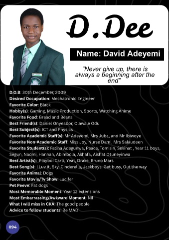 Favorite Academic Staff(s): Mr Adeyemi, Mrs Juba, and Mr Ibiwoye