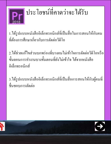 1. เพื่อพัฒนาหนังสออเล็กทรอนกส Adobe Premiere Pro CC 1.ได้รปแบบหนังสออเล็กทรอนกสทเปนสอในการสอนให้กับคน