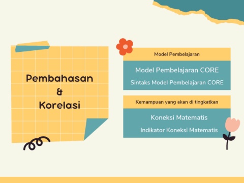 Model Pembelajaran Model Pembelajaran CORE Pembahasan Sintaks Model Pembelajaran CORE & Kemampuan yang akan di tingkatkan Korelasi Koneksi Matematis Indikator Koneksi Matematis