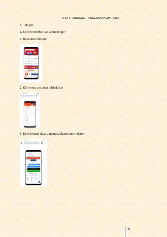BAB 4. PANDUAN PENGGUNAAN APLIKASI 4.1 shopee A. Cara mendaftar kan akun shoppe 1. Buka akun shoppe 2. Klik menu saya dan pilih daftar 3. Isi informasi akun dan masukkan nomer telepon 11
