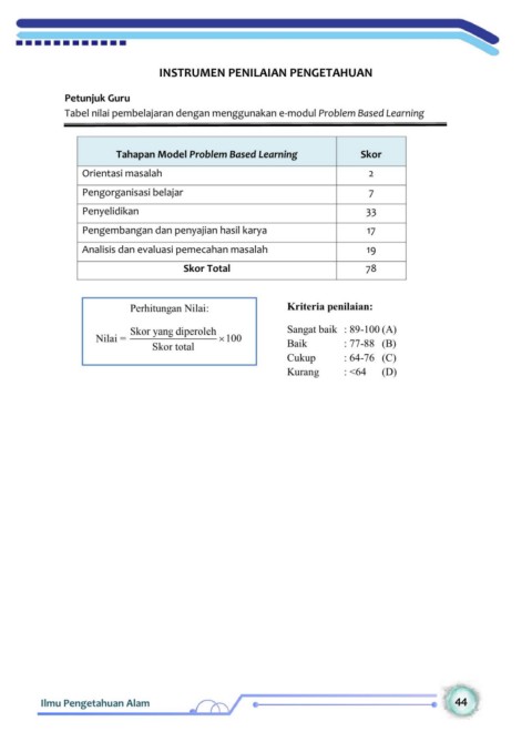 Tabel nilai pembelajaran dengan menggunakan e-modul Problem Based Learning