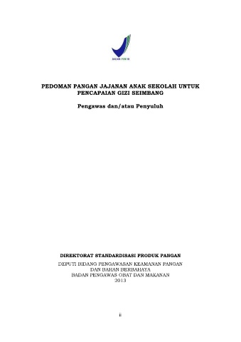 PEDOMAN PANGAN JAJANAN ANAK SEKOLAH UNTUK PENCAPAIAN GIZI SEIMBANG Pengawas dan/atau Penyuluh DIREKTORAT STANDARDISASI PRODUK PANGAN DEPUTI BIDANG PENGAWASAN KEAMANAN PANGAN DAN BAHAN BERBAHAYA BADAN PENGAWAS OBAT DAN MAKANAN 2013 ii