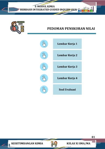 E-MODUL KIMIA BERBASIS INTEGRATED GUIDED INQUIRY (IGI) PEDOMAN PENSKORAN NILAI Lembar Kerja 1 Lembar Kerja 2 Lembar Kerja 3 Lembar Kerja 4 Soal Evaluasi 81 KESETIMBANGAN KIMIA KELAS XI SMA/MA