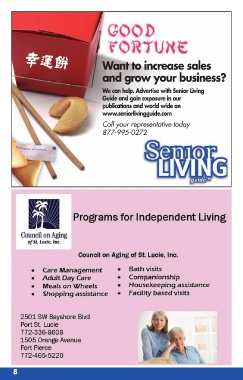Want to increase sales and grow your business? We can help. Advertise with Senior Living Guide and gain exposure in our publications and world wide on www.seniorlivingguide.com Call your representative today 877-995-0272 8