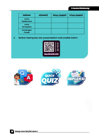 E-Handout Bioteknologi Indikator A(Kedelai) B(non-Kedelai) C(non-Kedelai) Lama Perebuasan Lama Fermentasi Kandungan Protein 3. Berikan kesimpulan dan presentasikan hasil analisis kalian! https://bit.ly/3EvcAEU 12 Biologi untuk SMA/MA kelas X