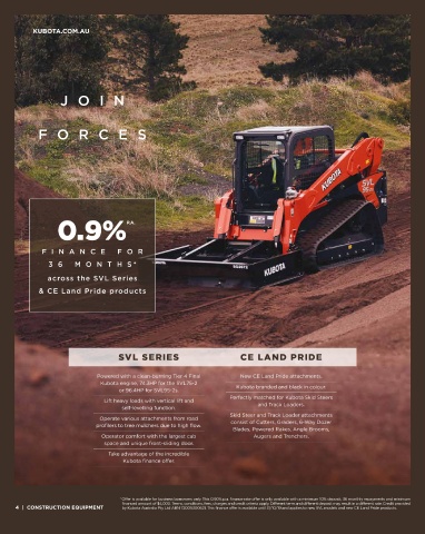 4 | CONSTRUCTION EQUIPMENT by Kubota Australia Pty Ltd ABN 72005300621. This finance offer is available until 31/10/19 and applies to new SVL models and new CE Land Pride products. Credit provided by Kubota Australia Pty Ltd ABN 72005300621. This finance offer is available until 31/10/19 and applies to new R series models. CONSTRUCTION EQUIPMENT | 5