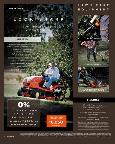 4 | MOWERS fees and charges. Different terms, fees or other loan amounts may result in a different comparison rate. This finance offer is available until 31/10/19 and applies to new GR Series and T Series models. a discount at a time of sales and not redeemable for cash. The offer ends 31/10/19. GENERATORS | 5