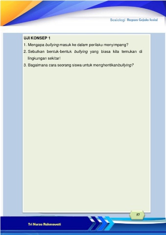 UJI KONSEP 1 1. Mengapa bullying masuk ke dalam perilaku menyimpang? 2. Sebutkan bentuk-bentuk bullying yang biasa kita temukan di lingkungan sekitar! 3. Bagaimana cara seorang siswa untuk menghentikan bullying? 57 62 16 59 11 65 9