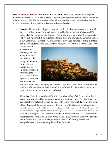 • Lacoste: The attractive village is dominated by the old chateau that once was owned by