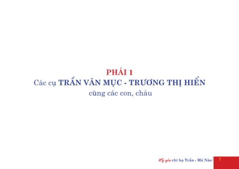 PHÁI 1 Các cụ TRẦN VĂN MỤC - TRƯƠNG THỊ HIỂN cùng các con, cháu Kỷ yếu chi họ Trần - Mã Não 7