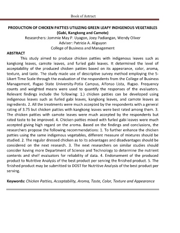 acceptability of bread is directly correlated to its shape, texture, shelf-life and its aroma. The chicken patties with camote leaves were much accepted by the respondents but